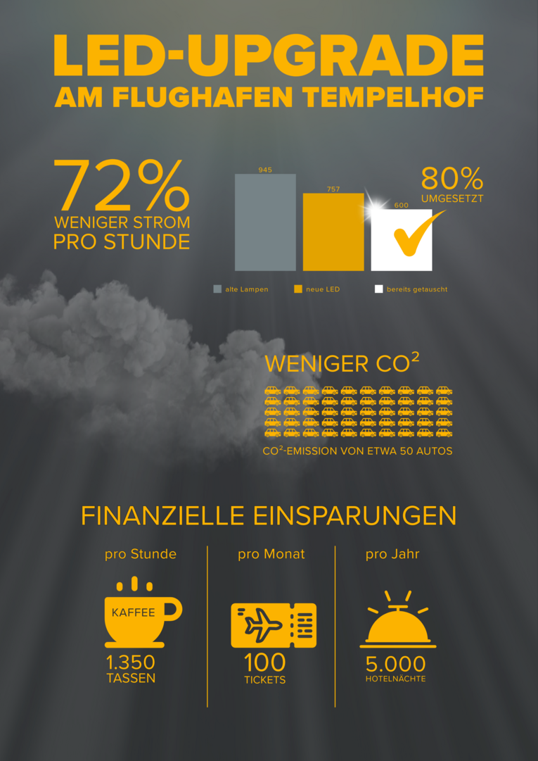 Die Beleuchtung des Flughafens ist nicht nur funktional, sondern steht auch unter Denkmalschutz. Seit 2022 arbeitet die Tempelhof Projekt GmbH daran, diese effizienter und nachhaltiger zu gestalten und dabei die historische Optik zu erhalten. Seit dem ersten Austausch der Altbeleuchtung an der Dachkante im Dezember 2022 und in den Hangars 1 bis 5 2023 erfolgte 2024 der Austausch in den Hangars 6 und 7. Die alten HQ-Lampen wurden dabei durch energiesparende LEDs ersetzt, wodurch sich der Strombedarf durch die Beleuchtung mehr als halbiert hat. Die Betriebskosten sinken erheblich – schon nach etwa einem Jahr werden die Investitionen durch die Einsparungen wieder ausgeglichen sein.