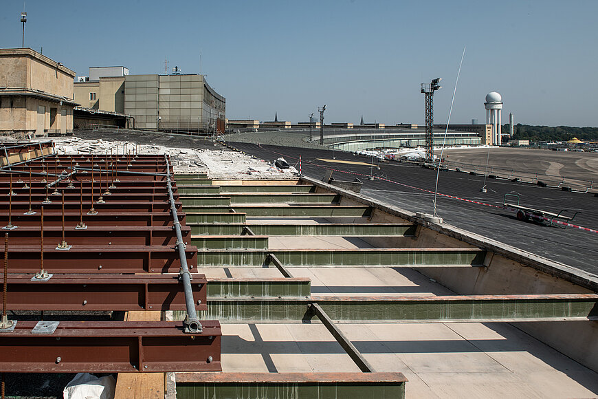 Seit Ende Mai 2024 laufen die Bauarbeiten zur Dach- und Betondeckensanierung der Vorfeldüberdachung am Flughafen Tempelhof. Damit hat der letzte Bauabschnitt der 2012 gestarteten gesamten Sanierung des 1,2 Kilometer langen Daches des Flughafengebäudes begonnen. Zu den Maßnahmen gehören unter anderem die oberseitige Erneuerung des Dachaufbaus inklusive Freilegung der historischen Stufen der einst geplanten Besucherterrasse sowie die unterseitige Sanierung der Stahlbetondecke. Auch der ikonografische Schriftzug „Berlin Tempelhof“ wird denkmalgerecht saniert.